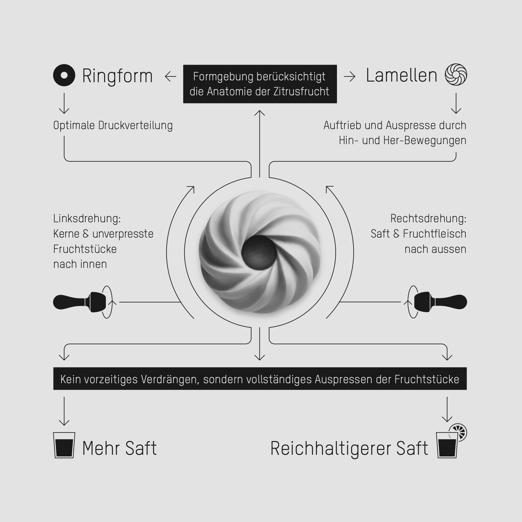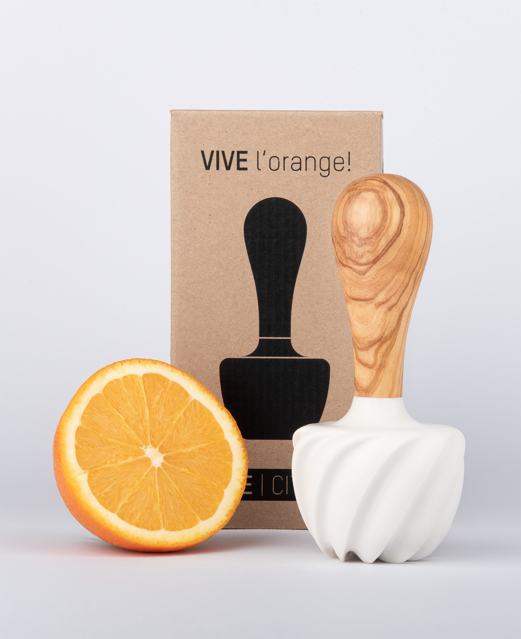 Die Formgebung von VIVE l'orange! orientiert sich an der Anatomie der Frucht. Statt der typischen Spitzform wurde eine Ringform zum Pressen realisiert. Die Vertiefung dient als Auffangtrichter für Kerne und Nabel. Die speziell profilierten Lamellen sorgen bei einer wechselseitigen Drehbewegung dafür, dass Fruchtstücke nicht vorzeitig in den Saft fallen, sondern vollständig ausgepresst werden. Das Ergebnis ist mehr und reichhaltigerer Saft.